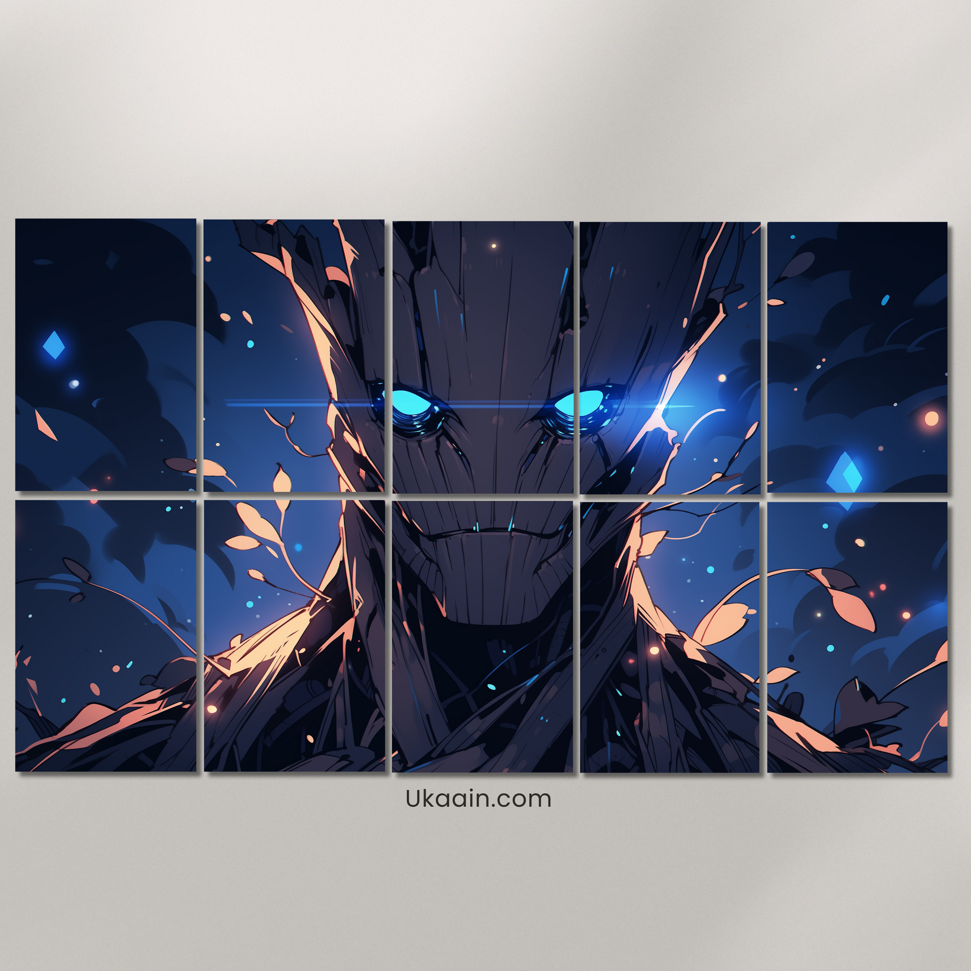 "Neon Guardian: 10-Panel Cybernetic Groot Glow Canvas - Premium Metal Poster